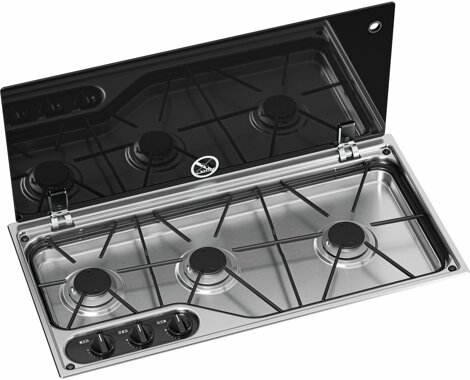 Einbau-Kochmulde mit Abdeckung aus temperaturbeständigem Sicherheitsglas und Gasabschaltfunktion bei geschlossener Abdeckung; mit Sicherheitszündsystem und elektronischer Zündung (Anschlussspannung 12 Volt wird benötigt), Leistung 1 x 1,1 kW, 1 x 1,6 kW, 1 x 2 kW, Gasverbrauch 146 g/h. Einbautiefe 9,7 cm, Ausschnittmaße 68,2 x 33,8 cm, Außenmaße 70 x 35 cm, Gewicht 6,7 kg.