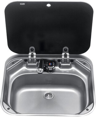 Diese stilvolle, eingelassene Spüle zeichnet sich durch ihre rechteckige Form und ihren hitzebeständigen Deckel aus Sicherheitsglas aus. Eine ideale Lösung für mobile Küchen.