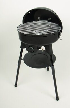 Gasgrill mit 3 höhenverstellbaren Metallbeinen und Kunststoff-Standfüßen. Bequeme Arbeitshöhe, 67/98 cm. Kann ohne Metallbeine auch als Tischgrill verwendet werden. Mit Rechtsgewinde.
