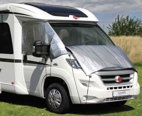 Einteilige, abklappbare Außen-Isoliermatte für teilintegrierte + Alkoven-Reisemobile + Kastenwagen: Schutz vor Hitze und Kälte, Rundum-Isolierung des Fahrerhauses. Alubedampfte Oberfläche reflektiert die Sonneneinstrahlung.