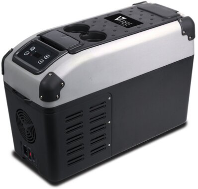 Mobile Kompressor-Kühlbox von VitrifRigo zum Einsatz im Fahrzeug. Leicht herausnehmbar, z.B. zum Picknick. Nennverbrauch: 45W