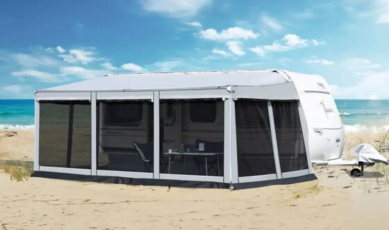 Ein leicht montierbares Markisenzelt, das komplett in den Keder des Fahrzeuges eingezogen wird. Es besticht durch seine Flexibilität, denn seine Einzelteile können je nach Anforderung kombiniert werden. Sie lassen sich einzeln als Wind-, Sicht-, Sonnen-, Moskitoschutz oder als komplettes Markisenzelt nutzen. Vorder- und Seitenelemente können durch eingenähte Reißverschlüsse zur Tür umgebaut werden.